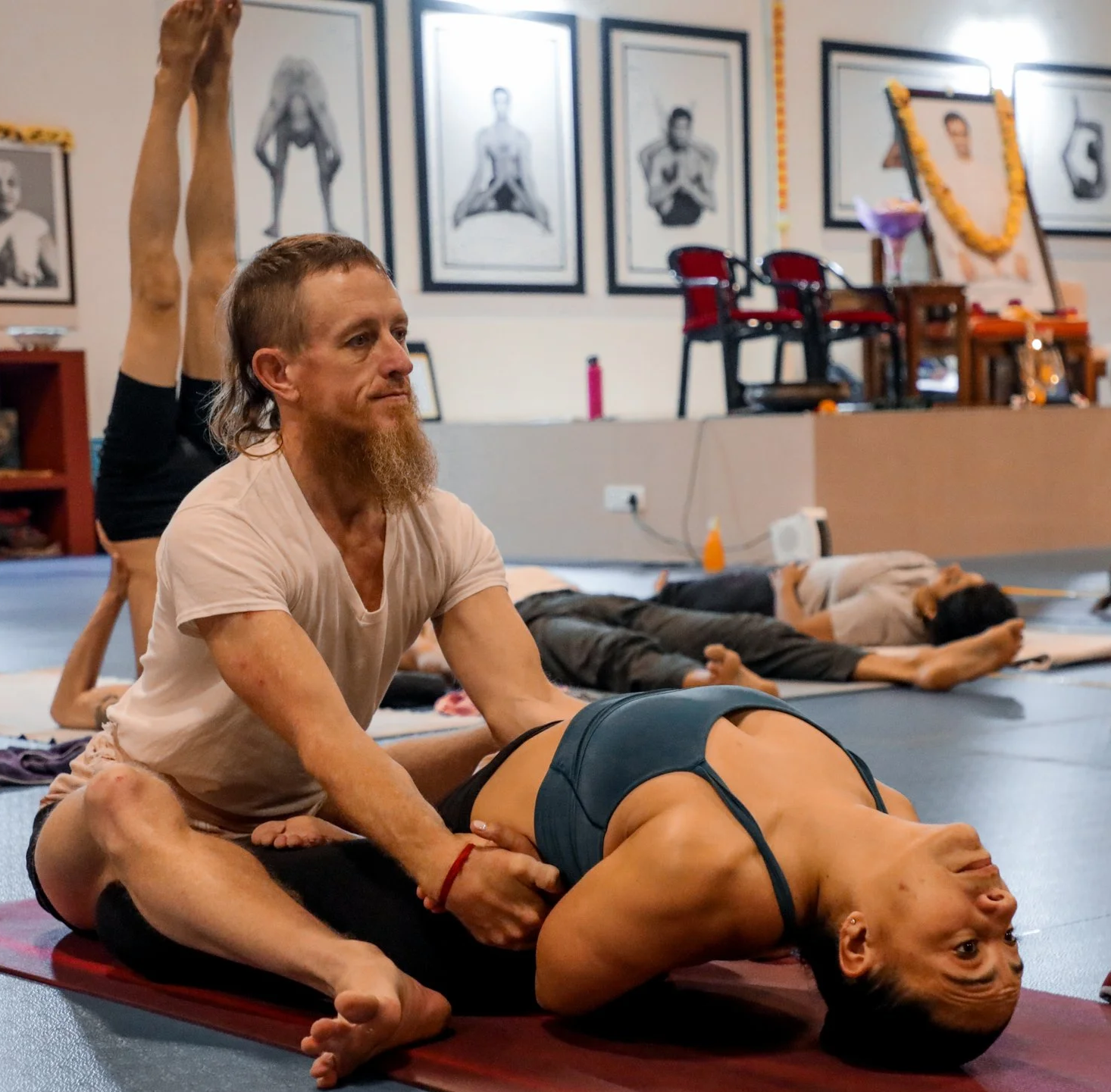 Once a research medical physicist, Andrew found his true calling in the practice of Ashtanga yoga. In 2014 Andrew first travelled to India to study with his teacher Sharath Jois at KPJAYI (now SYC) in Mysore. During the year and half in India Andrew practiced at KPJAYI for two seasons and he received Level II Authorization and Sharath Jois's blessing to teach Ashtanga. Andrew has taught students ranging from high school students to Tibetan monks at Sera monastery in India, where he lived teaching math and physics and practicing yoga.